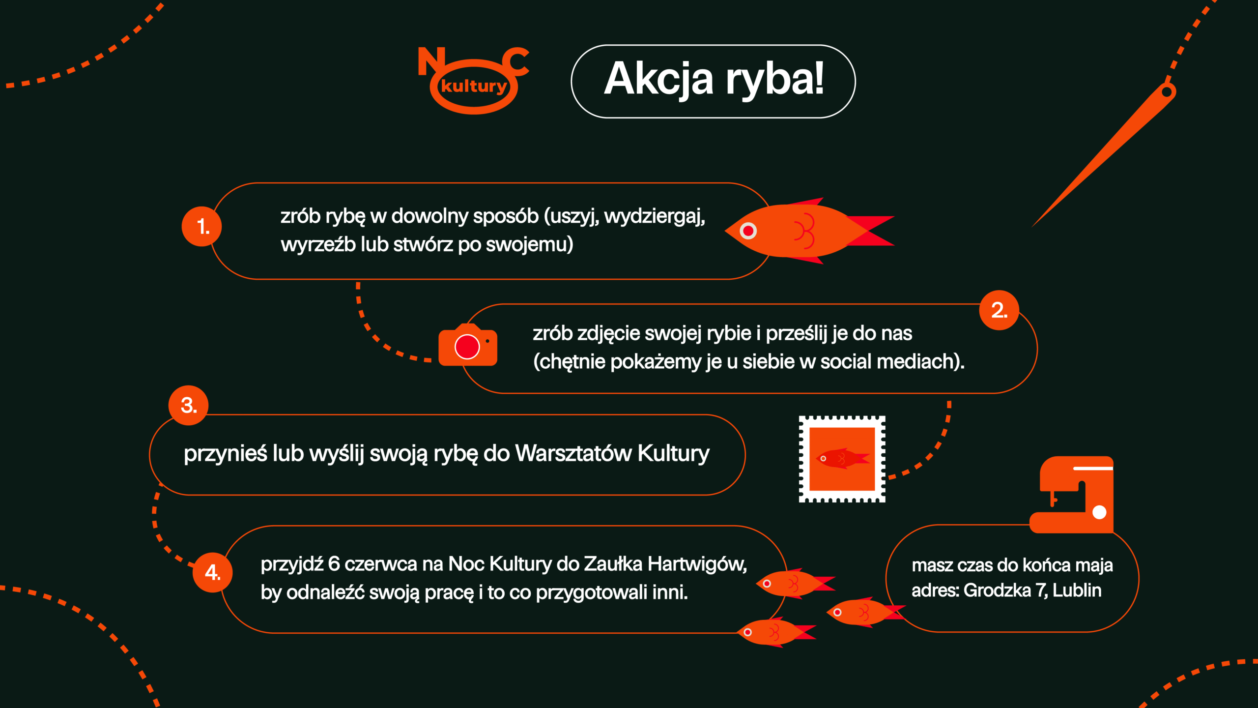 Na Wasze ryby czekamy do końca maja. Wystarczy przynieść je (wraz z informacją o autorze/autorce) do sekretariatu Warsztatów Kultury w Lublinie (I piętro) przy ul. Grodzkiej 7 – biuro otwarte jest od poniedziałku do piątku w godzinach od 9.00 do 17.00. Prace można też wysłać pocztą na adres: Warsztaty Kultury w Lublinie, Grodzka 7, 20-112 Lublin z dopiskiem Ryba na Noc Kultury. - wcześniej nie zapomnij zrobić zdjęcia swojej rybie (i sobie, jeśli chcesz!)